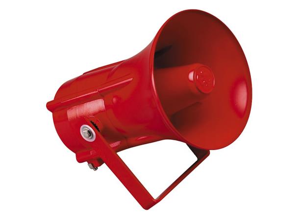 The ES Series of powered loudspeakers are rugged, re-entrant loudspeakers for use in Zone 1 hazardous areas. These speakers feature rugged cones and projectors constructed of aluminum. The wiring connections are enclosed in a dust- and moisture-proof compartment. All external suraces are finished with a red powder coat paint. Multiple models of the ES Series speakers are available. The 8 Watt, short horn produces 104dB, the 15 Watt