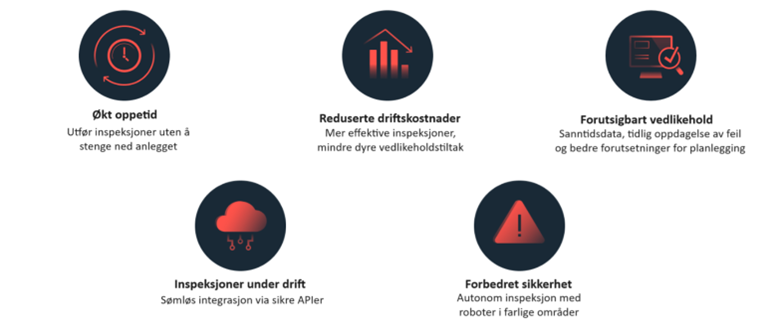 Den firbeinte roboten ANYmal samler termisk, akustisk, visuell og gassinformasjon og tolker dataene i sanntid. Ved hjelp av AI-basert navigasjon og robust design opererer ANYmal autonomt under krevende værforhold og komplekse anlegg.